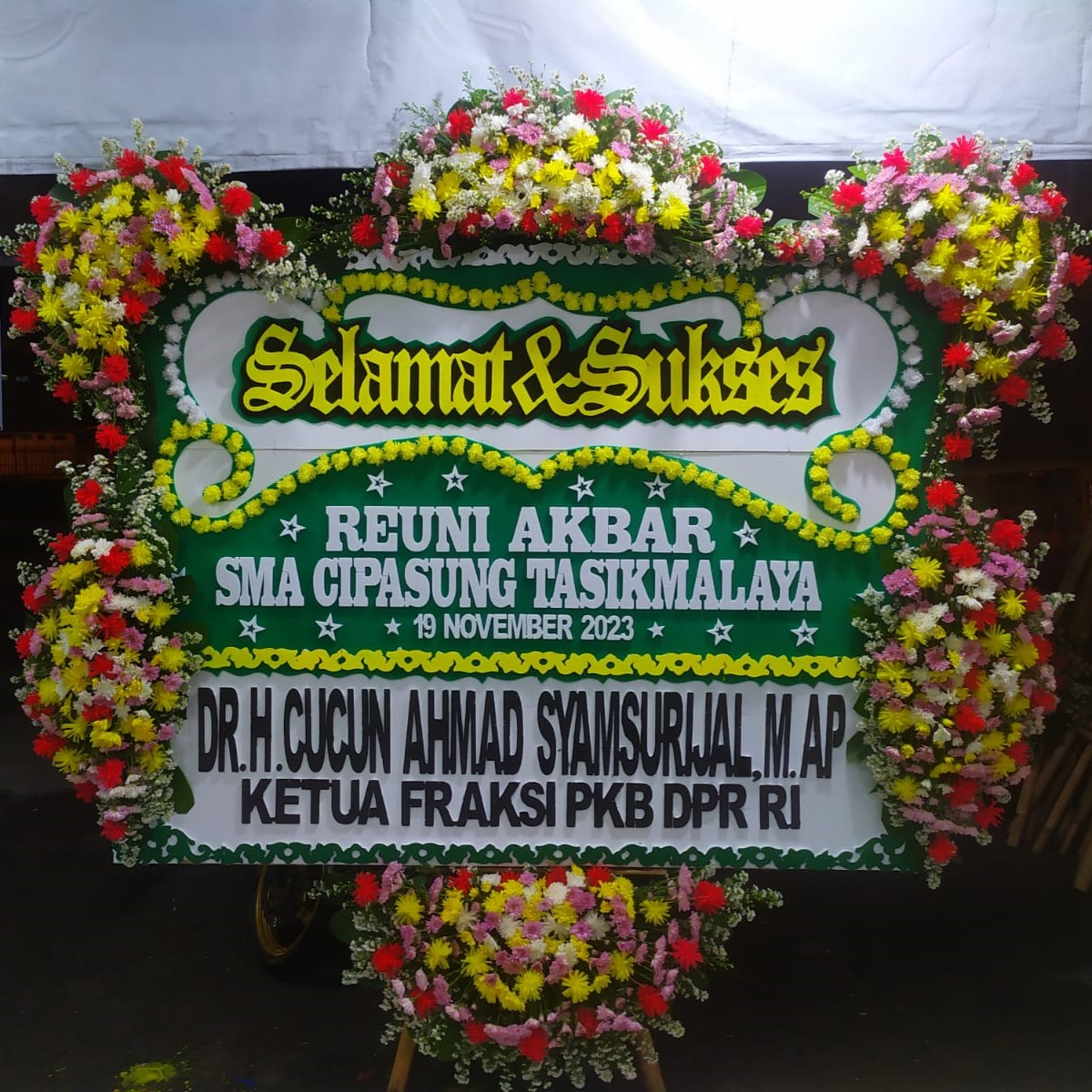Rangkaian bunga papan yang dapat digunakan untuk memberikan ucapan selamat. Dengan rangkaian bunga papan ini, Anda dapat menunjukan rasa hormat dan bahagia terhadap orang-orang terdekat Anda di momen-momen spesialnya.