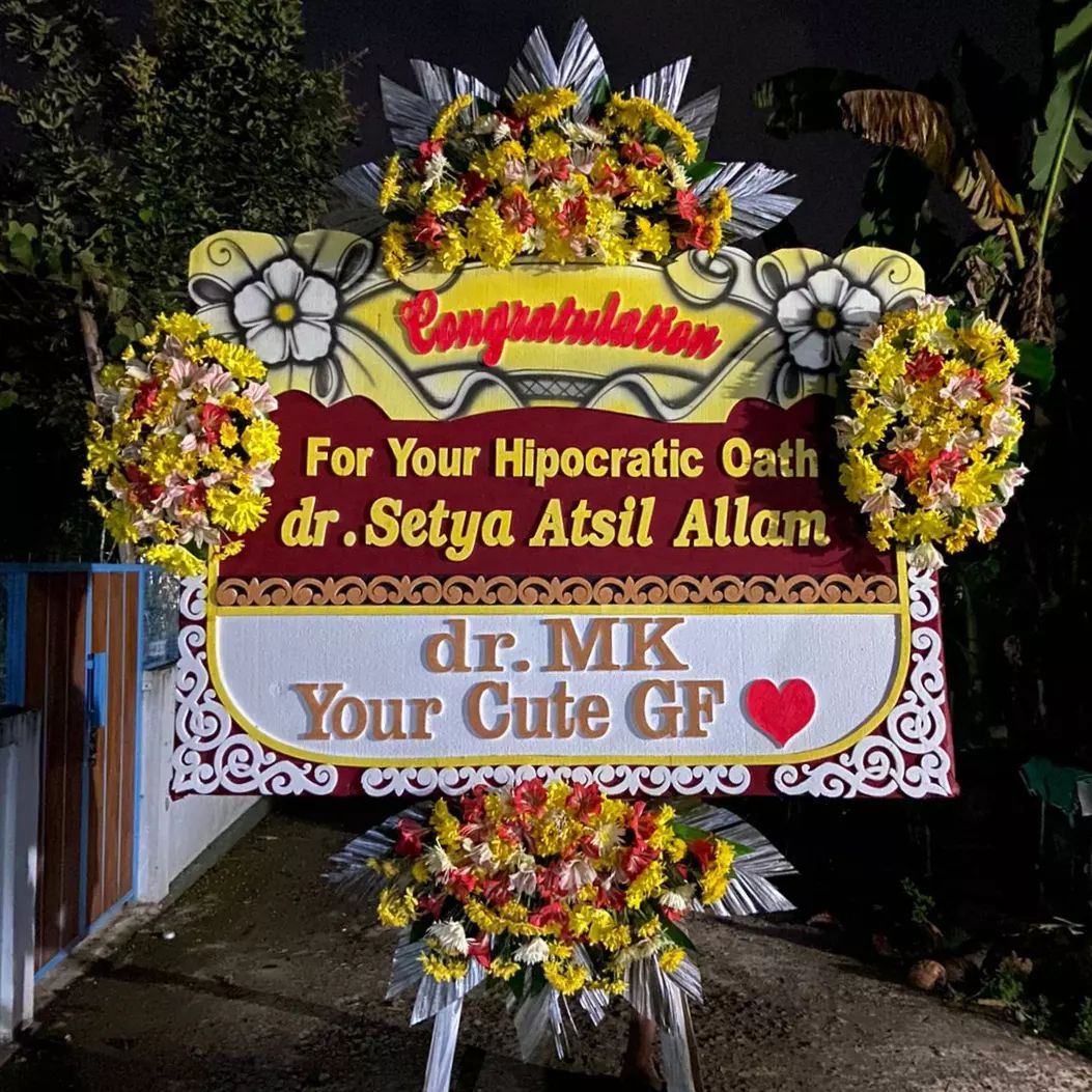 Rangkaian bunga papan yang dapat digunakan untuk memberikan ucapan selamat. Dengan rangkaian bunga papan ini, Anda dapat menunjukan rasa hormat dan bahagia terhadap orang-orang terdekat Anda di momen-momen spesialnya.