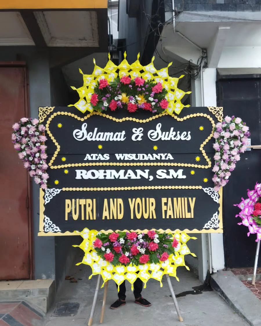 Rangkaian bunga papan yang dapat digunakan untuk memberikan ucapan selamat. Dengan rangkaian bunga papan ini, Anda dapat menunjukan rasa hormat dan bahagia terhadap orang-orang terdekat Anda di momen-momen spesialnya.