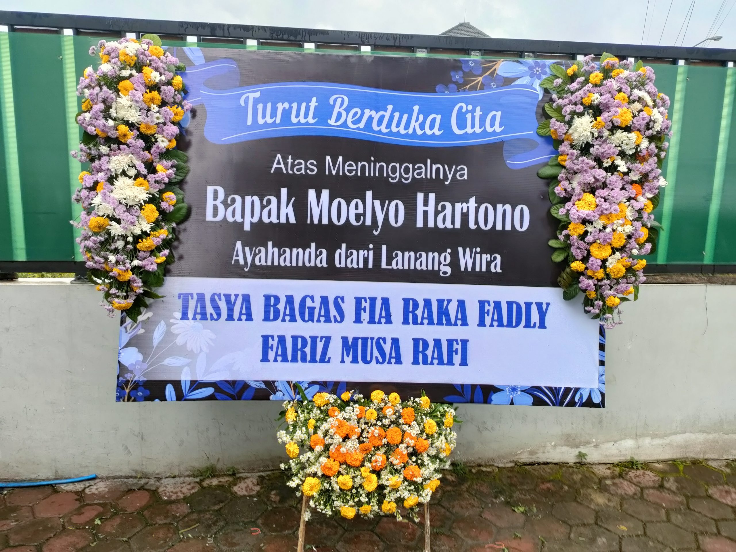 Produk ini terdiri dari beragam jenis bunga dengan warna yang beraneka macam, sesuai dengan model contoh karangan bunga duka cita. Komposisi tata letak tulisan yang rapi, dan bentuk tulisan yang jelas, serta warna background yang kontras membuat rangkaian bunga papan yang satu ini mudah terlihat oleh orang-orang yang ada.