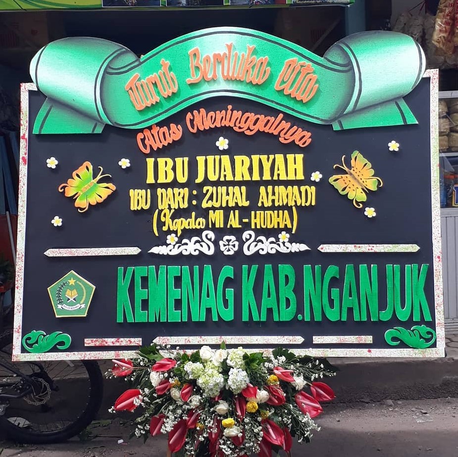 Produk ini terdiri dari beragam jenis bunga dengan warna yang beraneka macam, sesuai dengan model contoh karangan bunga duka cita. Komposisi tata letak tulisan yang rapi, dan bentuk tulisan yang jelas, serta warna background yang kontras membuat rangkaian bunga papan yang satu ini mudah terlihat oleh orang-orang yang ada.