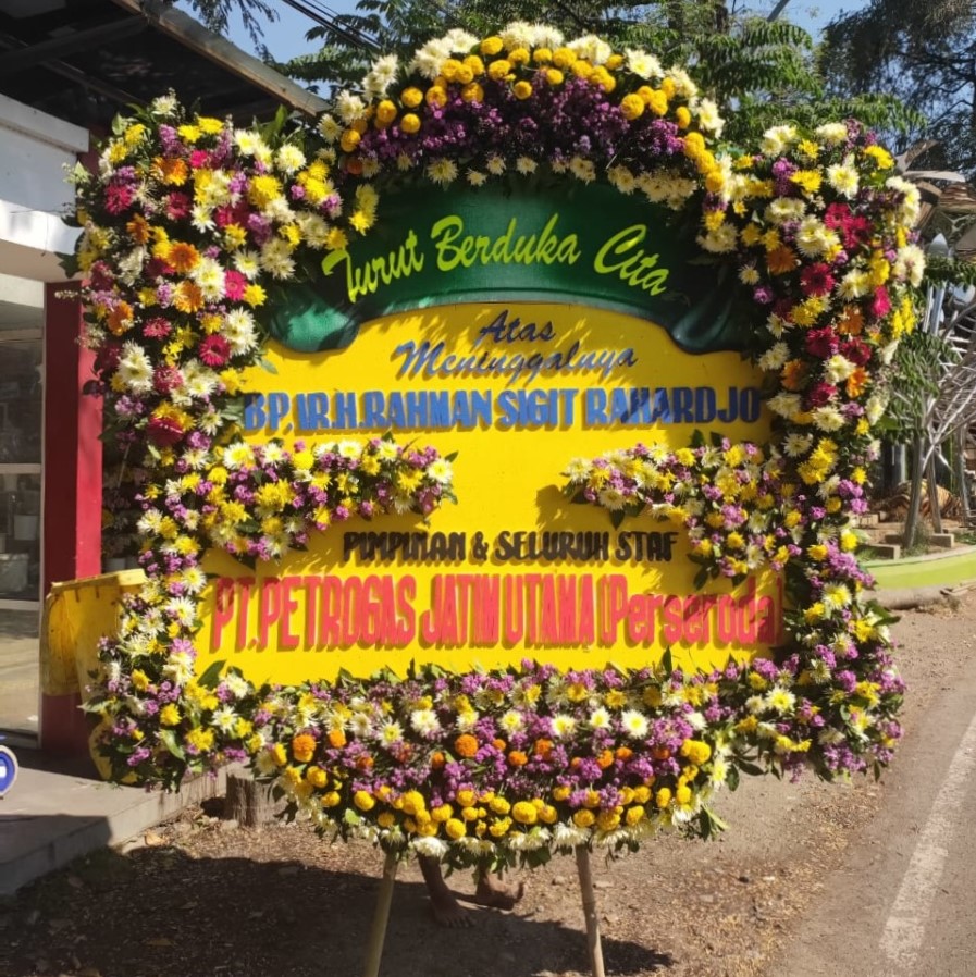 Produk ini terdiri dari beragam jenis bunga dengan warna yang beraneka macam, sesuai dengan model contoh karangan bunga pernikahan. Komposisi tata letak tulisan yang rapi, dan bentuk tulisan yang jelas, serta warna background yang kontras membuat rangkaian bunga papan yang satu ini mudah terlihat oleh orang-orang yang ada.