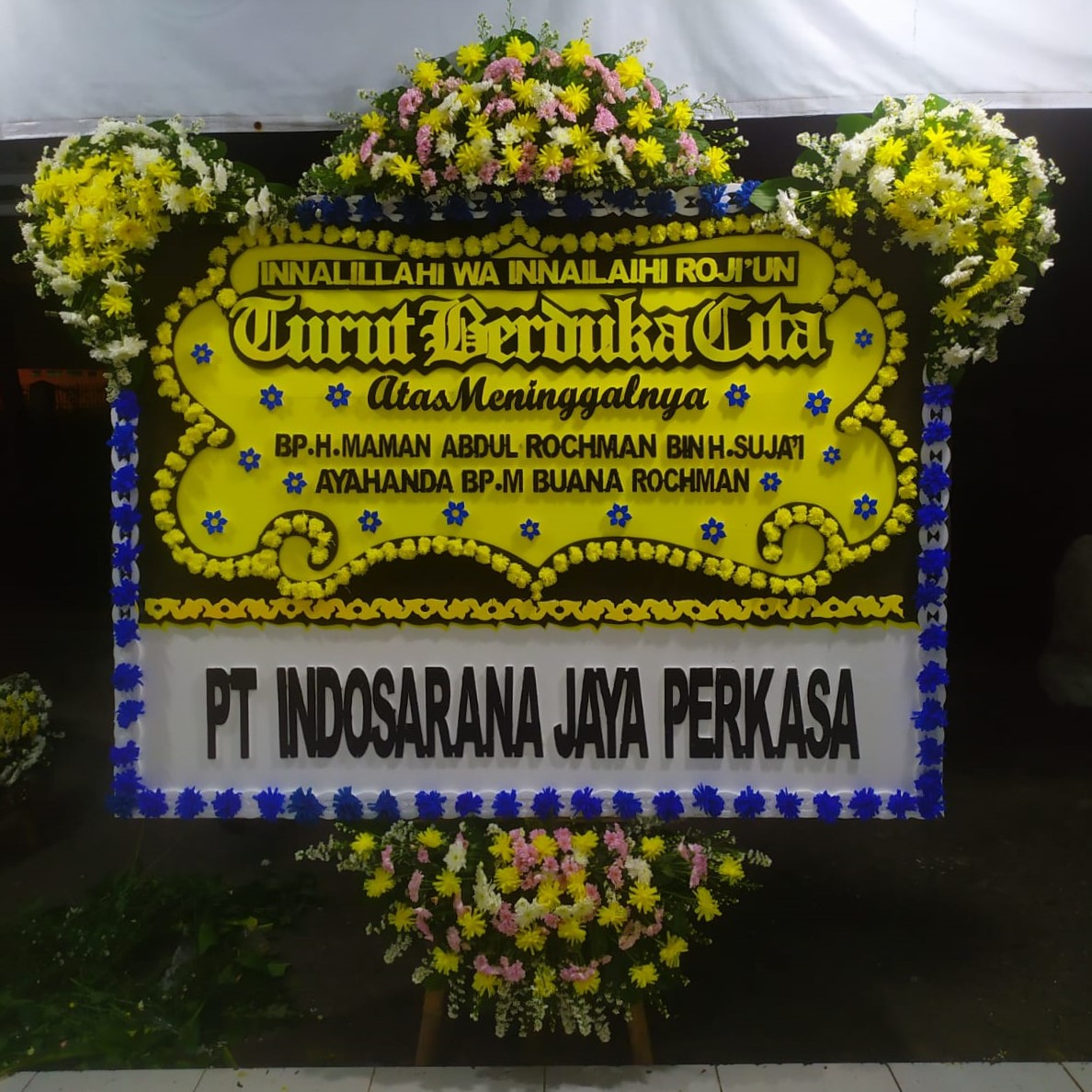 Produk ini terdiri dari beragam jenis bunga dengan warna yang beraneka macam, sesuai dengan model contoh karangan bunga duka cita. Komposisi tata letak tulisan yang rapi, dan bentuk tulisan yang jelas, serta warna background yang kontras membuat rangkaian bunga papan yang satu ini mudah terlihat oleh orang-orang yang ada.